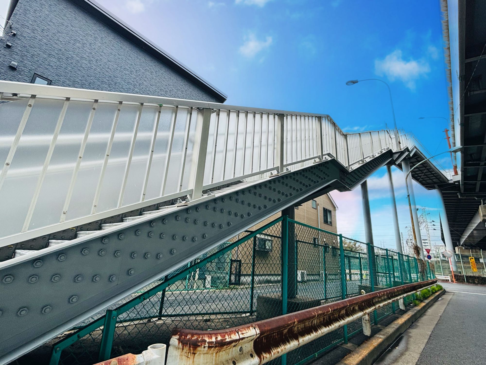 総武陸橋の歩道及び階段の補修のため、橋面舗装及び補修を行う工事